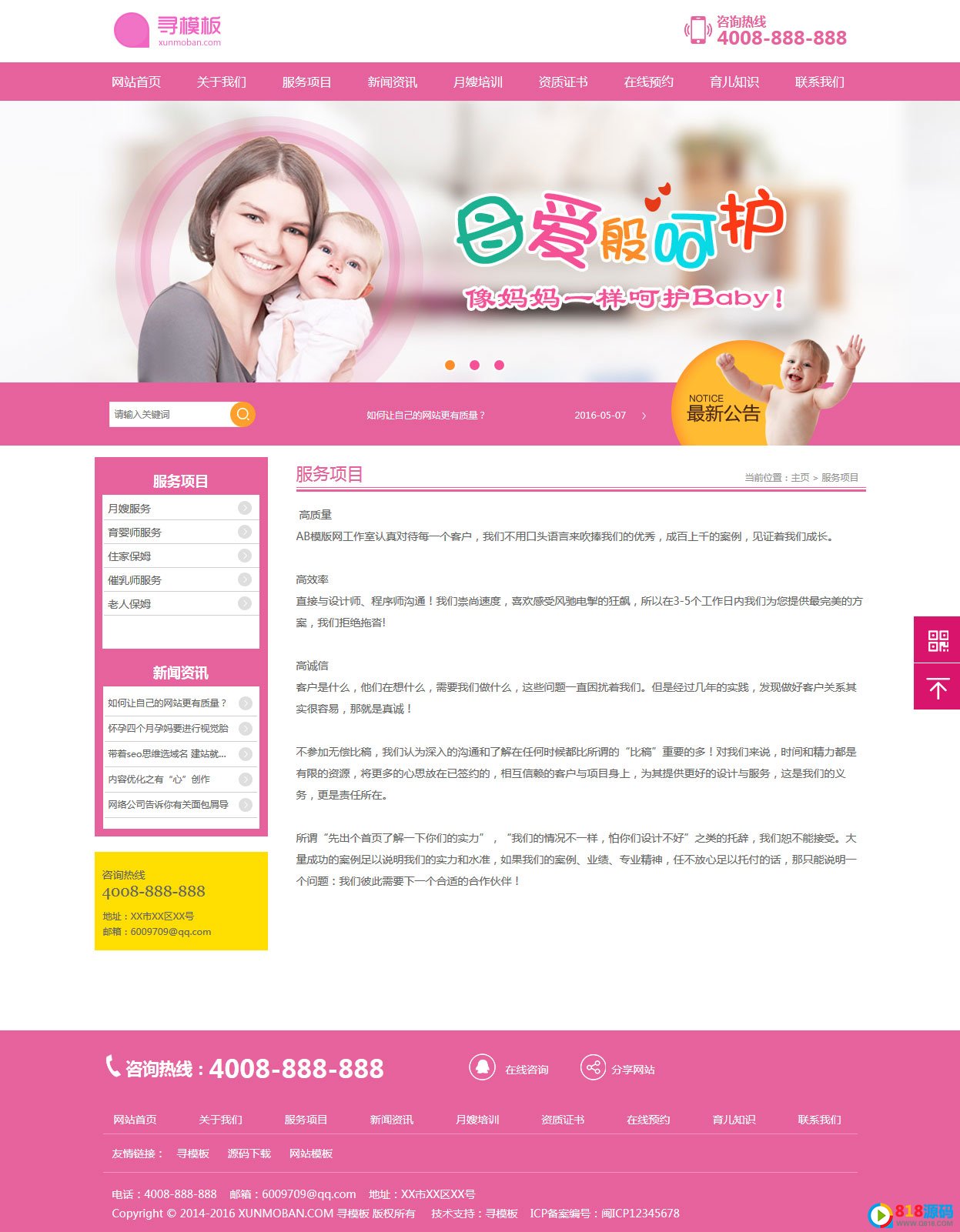 织梦简洁育婴家政保姆服务网站模板,适合各类服务行业网站使用,整体布局大气清晰干净,全局采用粉色系,大屏幻灯片更专业,兼容主流浏览器。模板附带测试数据,带安装说明。
