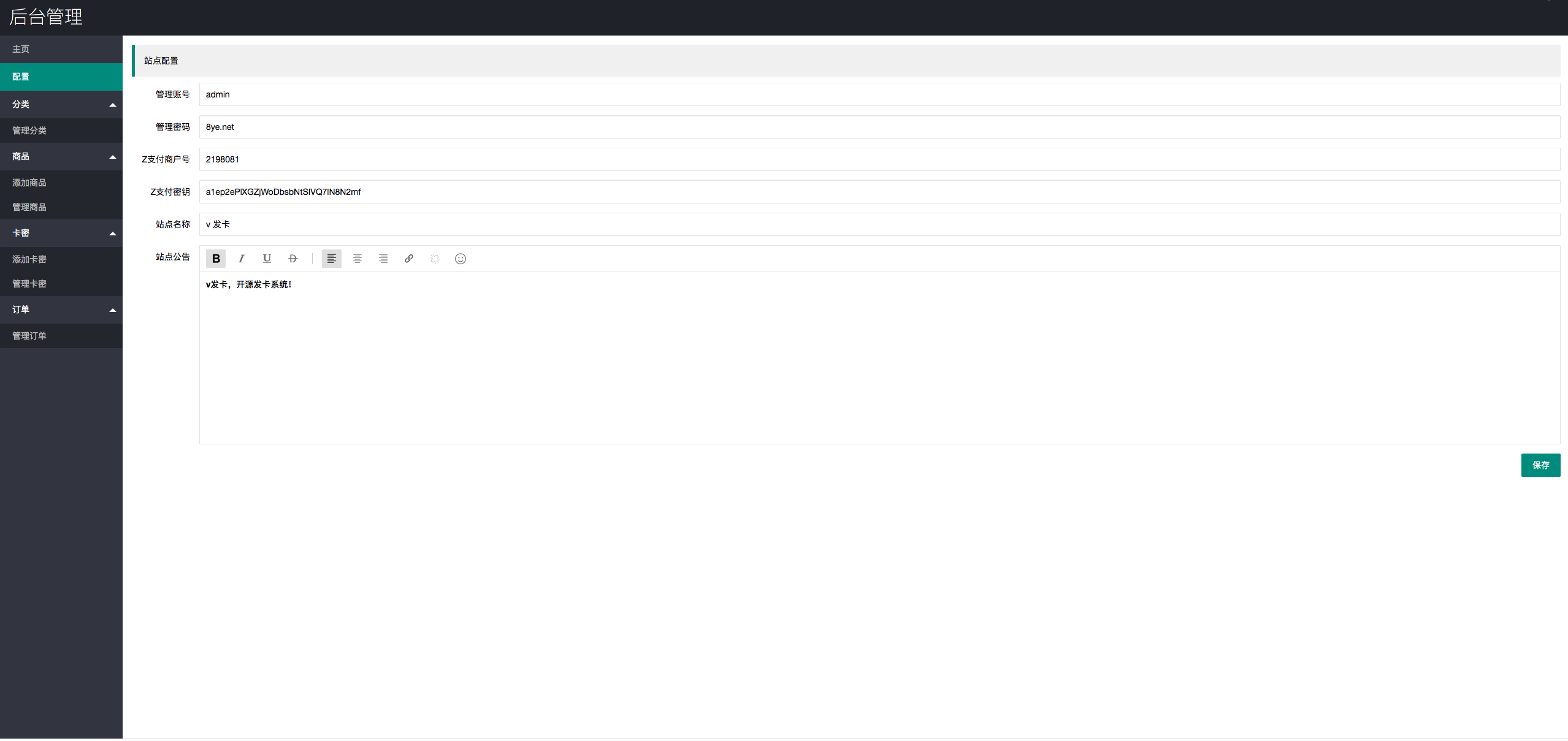 7、在后台-站点配置里填入您的商户号及密钥。